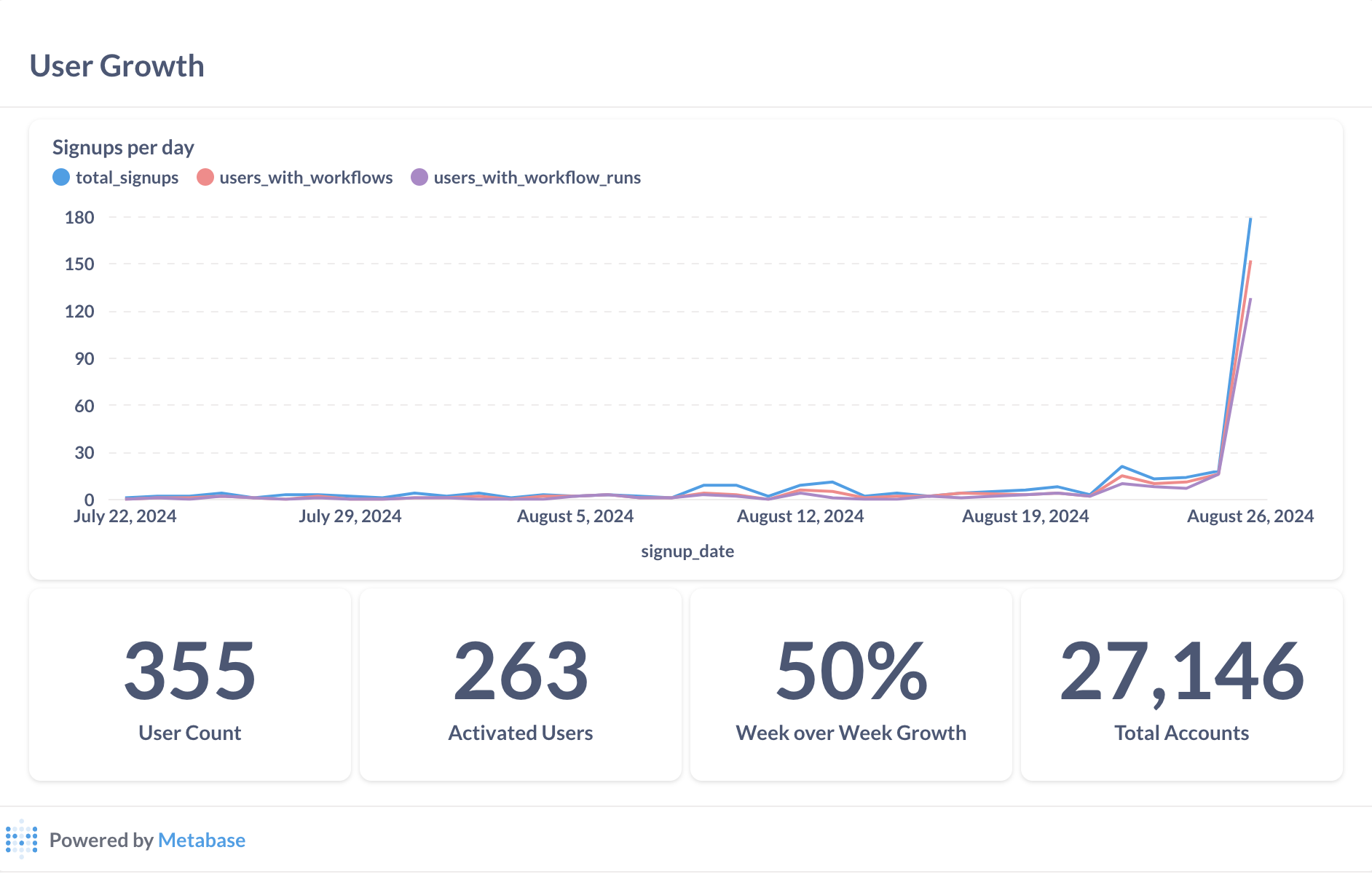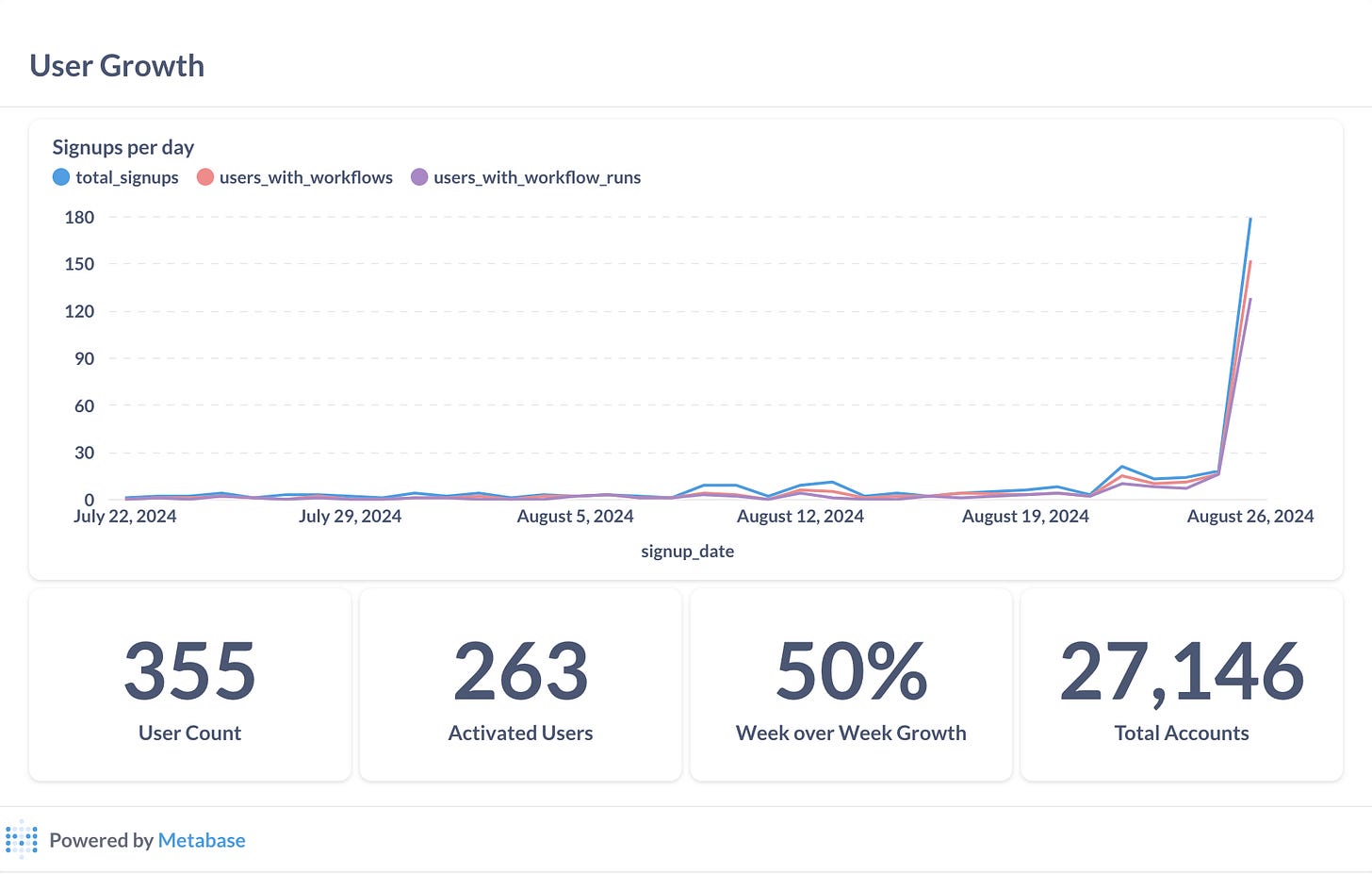 350 users, growing 30-50% w/w (sometimes more) for the past month. This week with launching we will probably grow more. The chart looks *super up* on launch, but the reality is it’s been compounding up until now