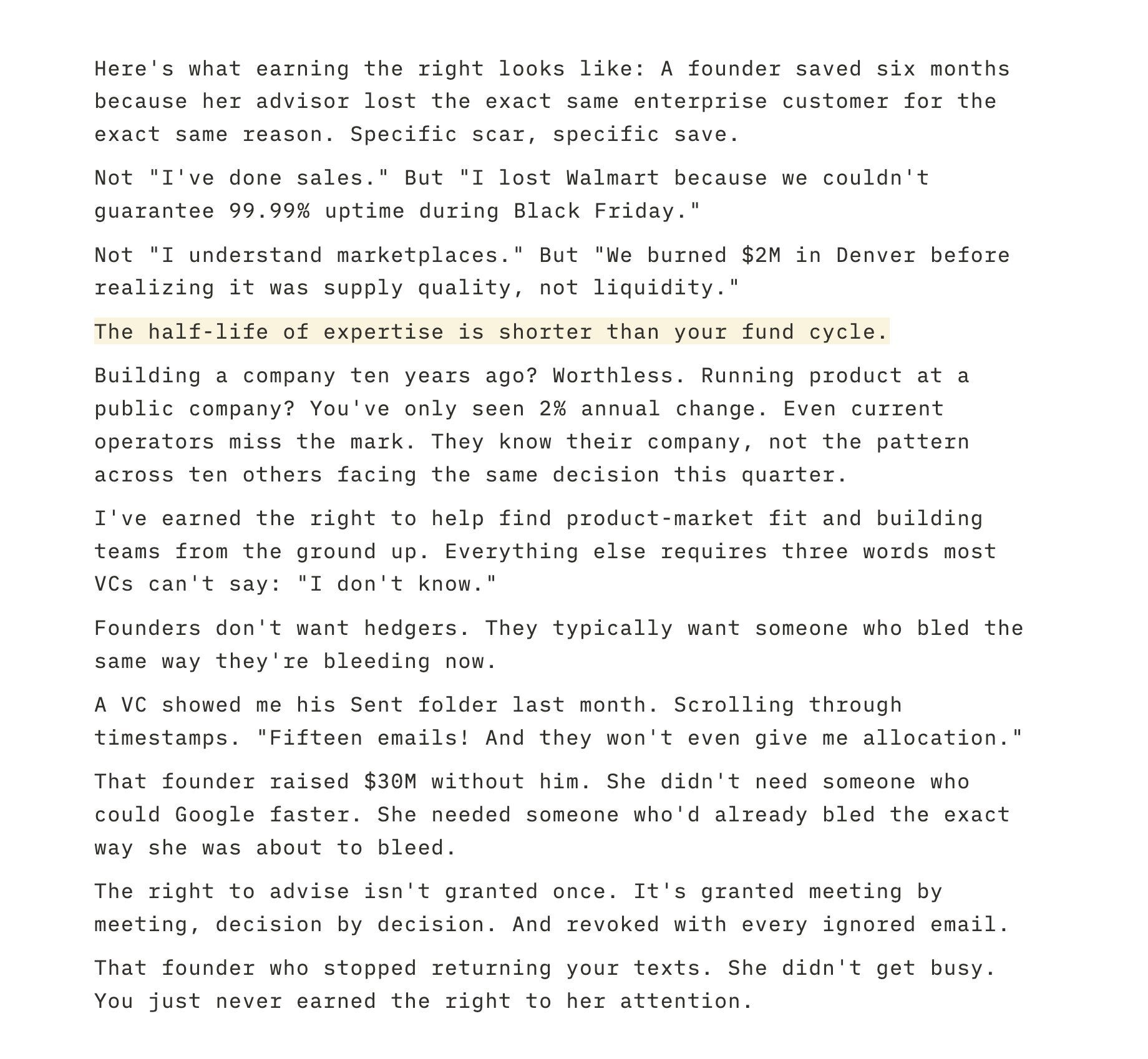 There isn’t a single degree or line on your resume that earns you the right to work with founders. The only thing that does is the experience of having done it yourself. If you have an MBA, have worked at some fancy firm, or think you’re really well networked, but have never started a company, I can tell you right now that you don’t have it.