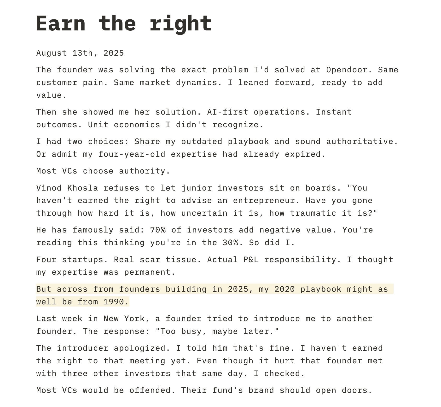 Being a founder is one of the most lonely jobs on the planet. The Khosla folks are big on “earning the right“ to work with founders and came out with a post today about it I’ll lead with: