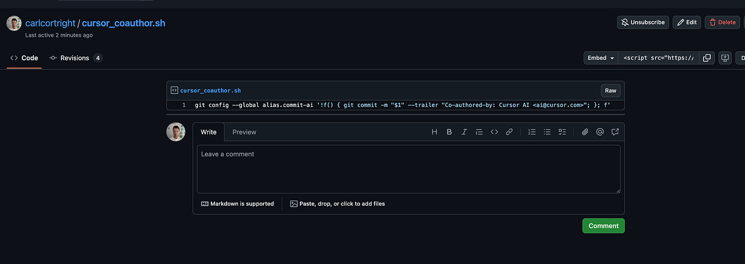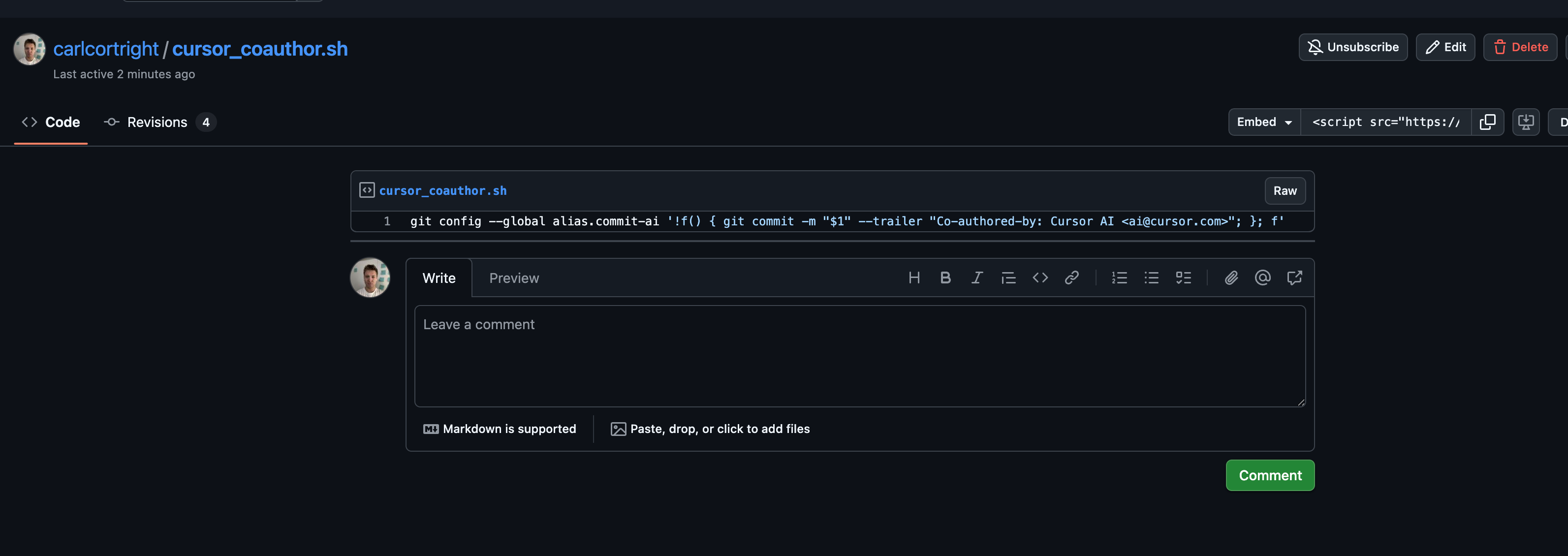 Was messing with it today, and created this simple co-author alias which adds cursor (or whatever ai you’re using as the coauthor to a commit so teams can track).