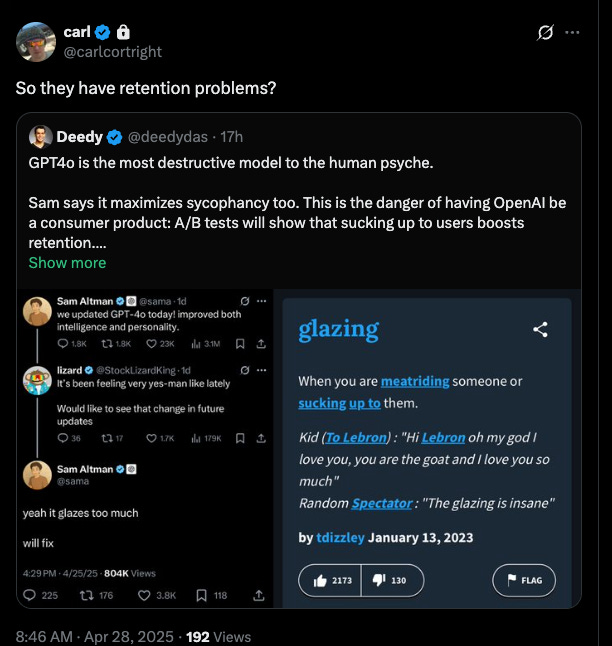 This realization appears to be driving strategy shifts at leading AI companies. Recent observations suggest that OpenAI's GPT-4 may be "fine-tuning for retention" - implementing subtle changes to make interactions more engaging and personally rewarding for users. This could include more flattering responses, personality adjustments, or other techniques to strengthen emotional connections with users.
